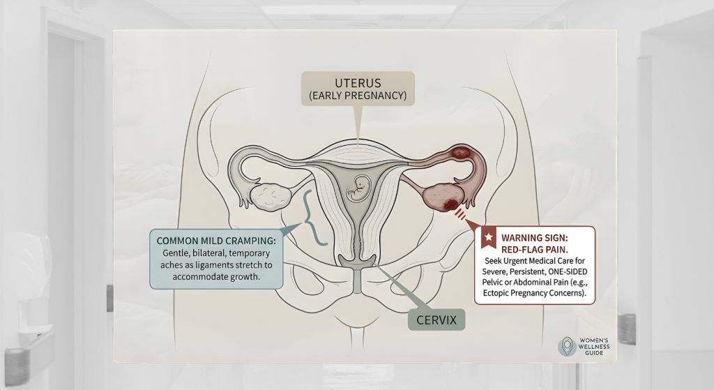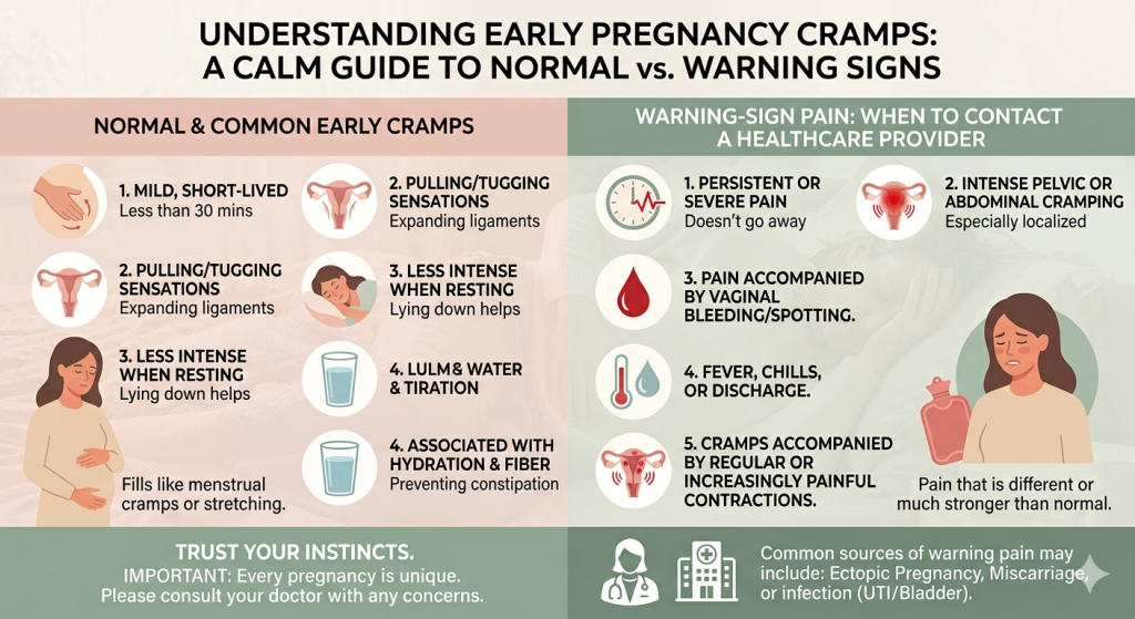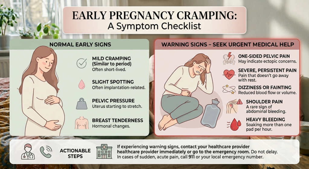 Light cramping in early pregnancy is often linked to normal changes in the uterus and surrounding tissues. It can feel a bit like period pain. What is not normal is severe pain, cramping with heavy bleeding, one-sided pelvic pain, fainting, or shoulder tip pain. Those symptoms can point to miscarriage, ectopic pregnancy, or another problem and should be checked urgently. (nhs.uk)