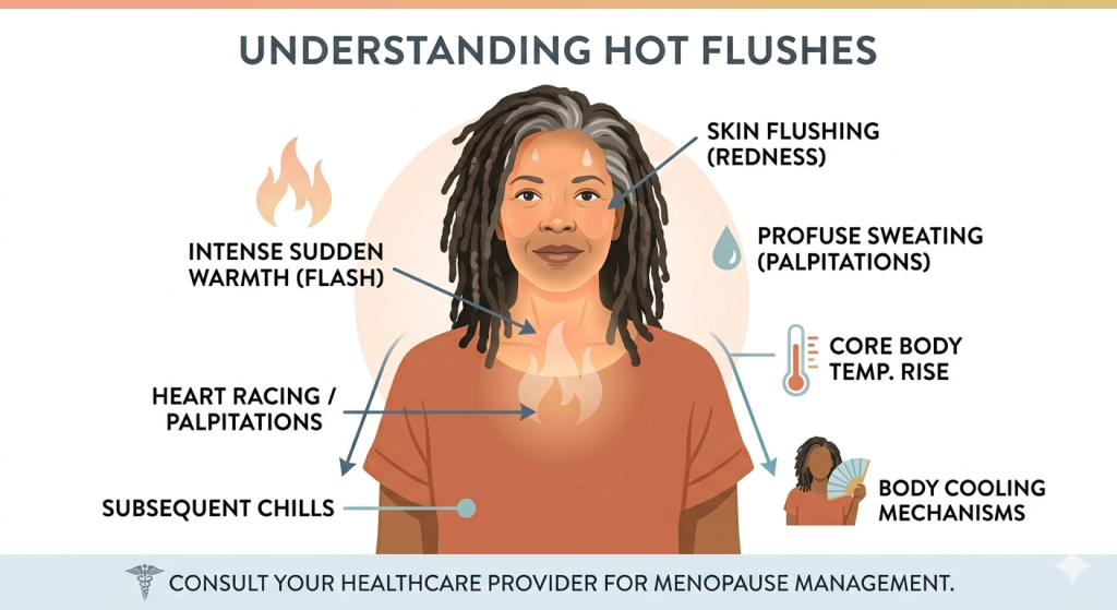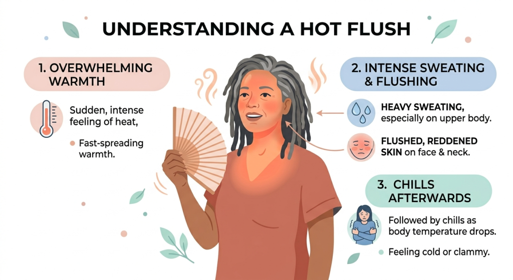 A hot flush is a short episode of sudden warmth that seems to spread quickly through the upper body. It may last for a few seconds or several minutes. Some women feel only mild warmth. Others feel intense heat, damp skin, and a strong need to remove layers, open a window, or cool down fast. When it happens during sleep, it is often called a night sweat.