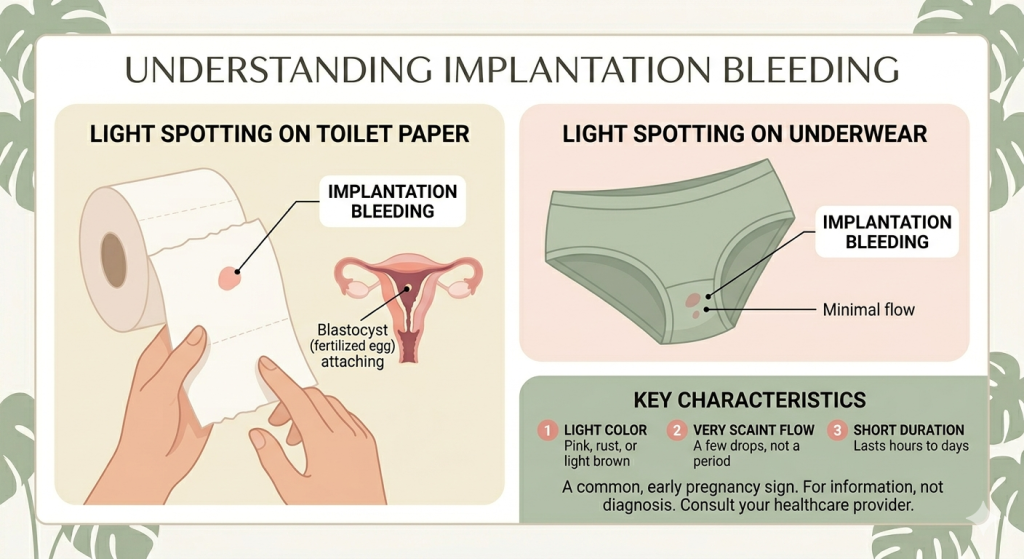 Implantation bleeding is light spotting that can happen when a fertilised egg attaches to the lining of the uterus in very early pregnancy. It is considered one possible early pregnancy sign, but not everyone experiences it. Some women notice nothing at all, while others may see just a few spots of blood on underwear or toilet paper. (Mayo Clinic)