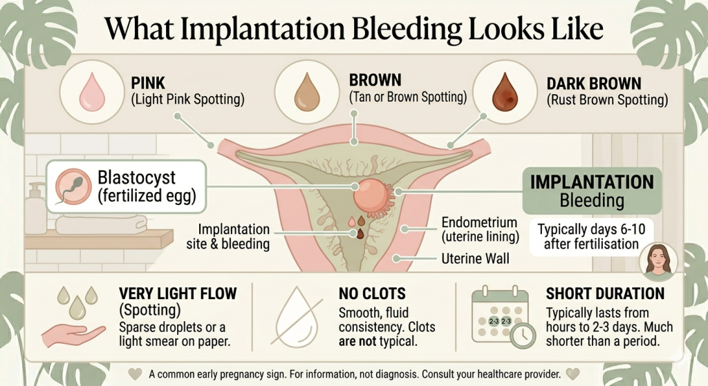 Implantation bleeding usually looks like very light pink, brown, or dark brown spotting and is much lighter than a period. It may occur around the time your period is due, which can make it confusing. The main thing to remember is that light spotting can happen in early pregnancy, but heavy bleeding, clots, severe pain, or feeling unwell should always be checked. A pregnancy test is the best way to move from guessing to knowing. (Cleveland Clinic)