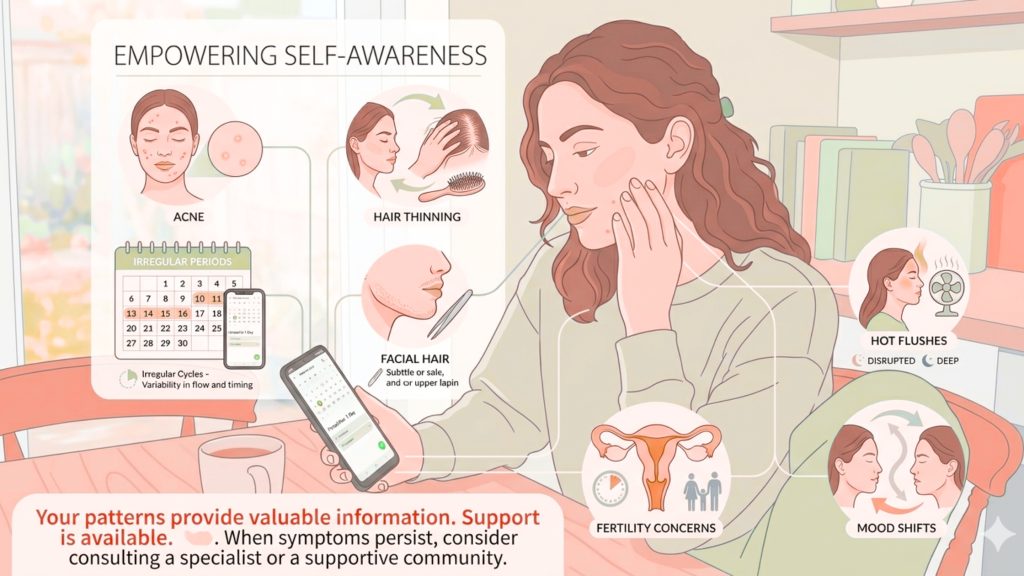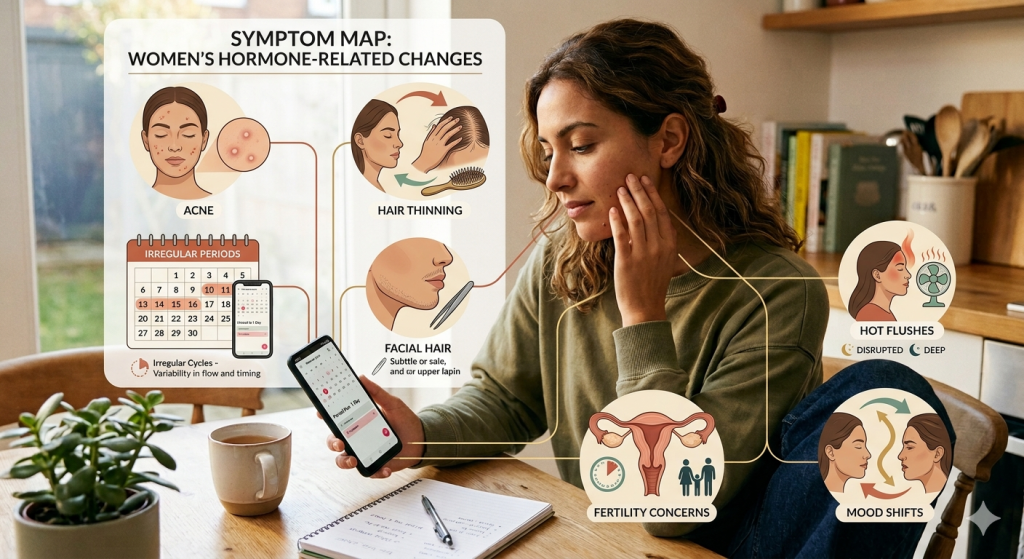 This is important because the same general feeling can come from different causes. Irregular periods and acne may suggest one pattern. Fatigue, feeling cold, and heavier periods may suggest another. Hot flushes, broken sleep, and cycle changes may fit a different life stage entirely.